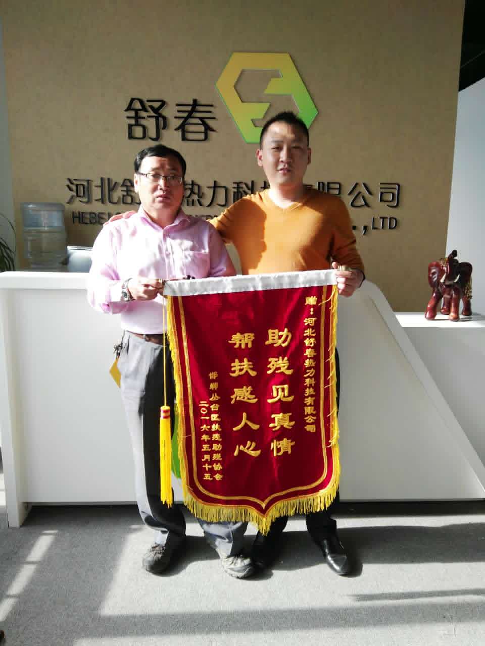 5月17日,邯鄲市殘聯(lián)肢殘人協(xié)會(huì)副主席、叢臺(tái)區(qū)殘聯(lián)肢殘人協(xié)會(huì)主席張鴻斌來(lái)到河北舒春熱力科技有限公司,親自送上錦旗,對(duì)河北舒春熱力科技公司的無(wú)償捐贈(zèng)表示衷心的感謝。