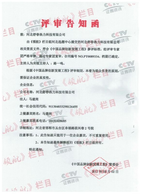 8月1日,河北舒春熱力科技有限公司迎來又一特大喜訊。河北舒春熱力科技有限公司與CCTV中國品牌創(chuàng)新發(fā)展工程《領(lǐng)航》欄目成功簽約。中國品牌創(chuàng)新發(fā)展工程----打造中國制造金字品牌。